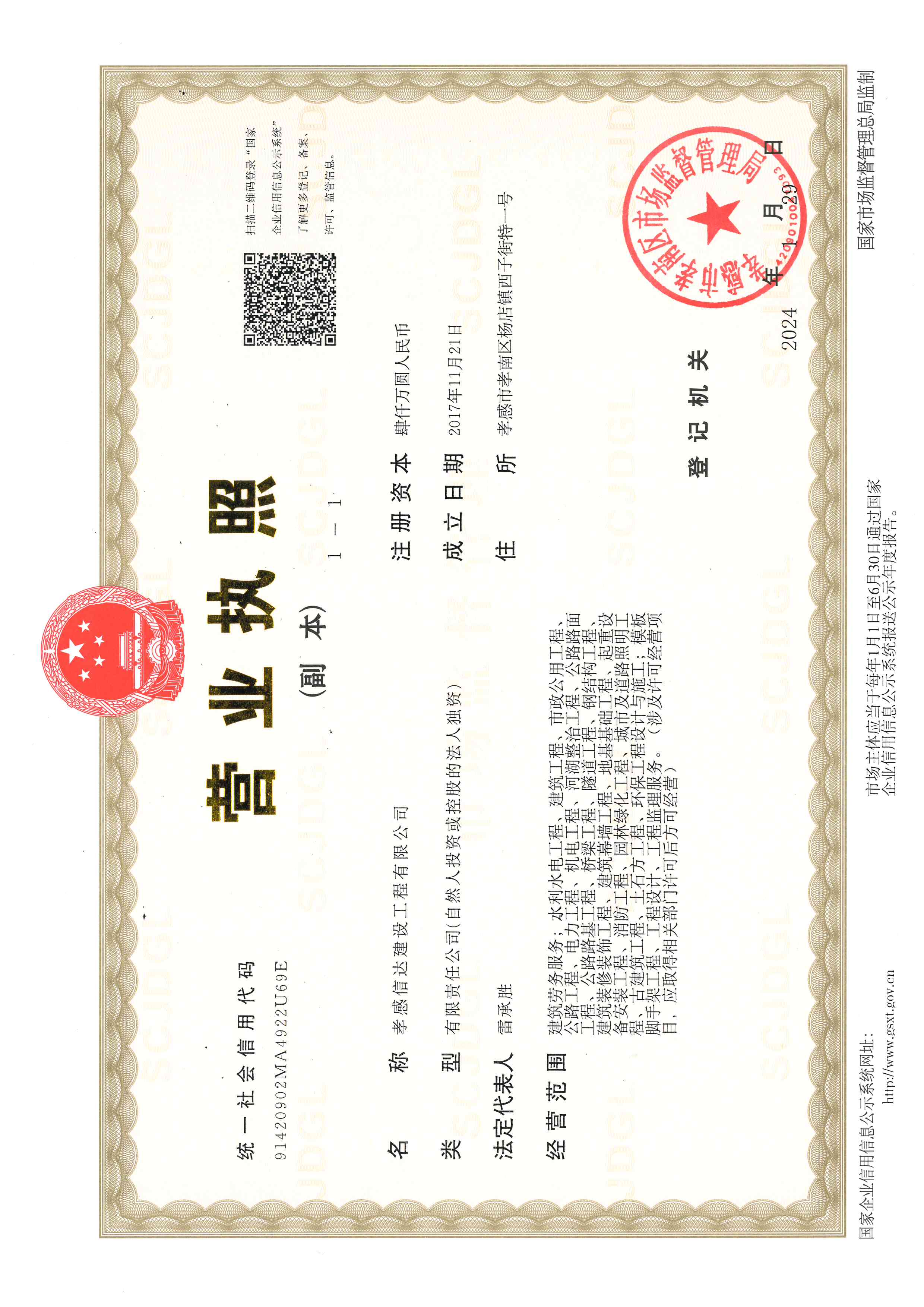 孝感信達(dá)建設(shè)工程有限公司成立于2017年11月21日,地址:孝感市孝南區(qū)楊店鎮(zhèn)西子街特一號(hào),注冊資金4000萬元,有限責(zé)任公司(自然人投資或控股)。
